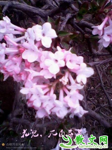老家院子有一棵开花的树,是父亲从祖籍百里路的深山挖来的,我不知道它的植物术语名叫什么,父亲管它叫“梧牛树”,树身有刺,一年花开三次,父亲看见花开,会边忙碌边笑着给我们说:“梧牛花,没事干,一年要开三四遍”。梧牛先开花,后长叶,临冬,大概农历九到十月,还有立春前后都开花。这棵树现在已经两米来高,花开得可热烈了!一院子香气,蜜甜蜜甜 ,你看,一串串,小喇叭似的,花团锦簇,这是它沐着早春的阳光,虽春寒料峭,周围还一片荒凉,不见一点绿色,叶子还未抽芽,梧牛却花开纷纷,四片花瓣凑成了一张灿烂的小脸,每一朵小脸都在向你笑,她是红粉佳人,小家碧玉,有些许害羞,又落落大方,白里透粉的小脸,修长的脖颈和身子。蜜蜂成群结队围着她,细听,嗡翁,嗡嗡,它们会从喇叭口钻进去,花儿长长的颈部是它们的蜜罐。