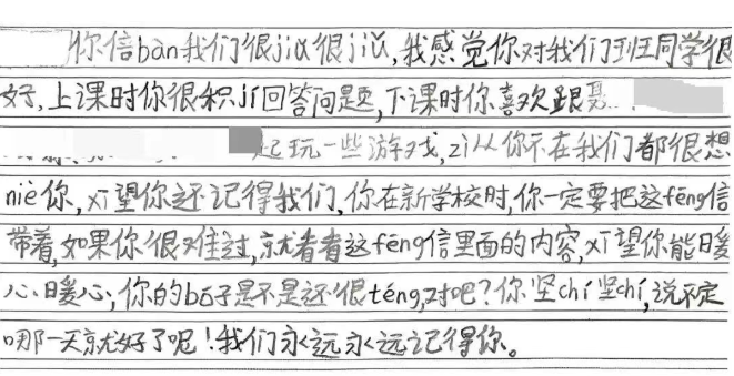 “在新学校时,你一定要把这封信带着,如果你很难过,就看看这封信里面的内容,希望能暖心……”“你到了新学校要交一个新朋友,不要天天都想着我们……”“要是以后你想我们大家,就当作我们在你面前……”